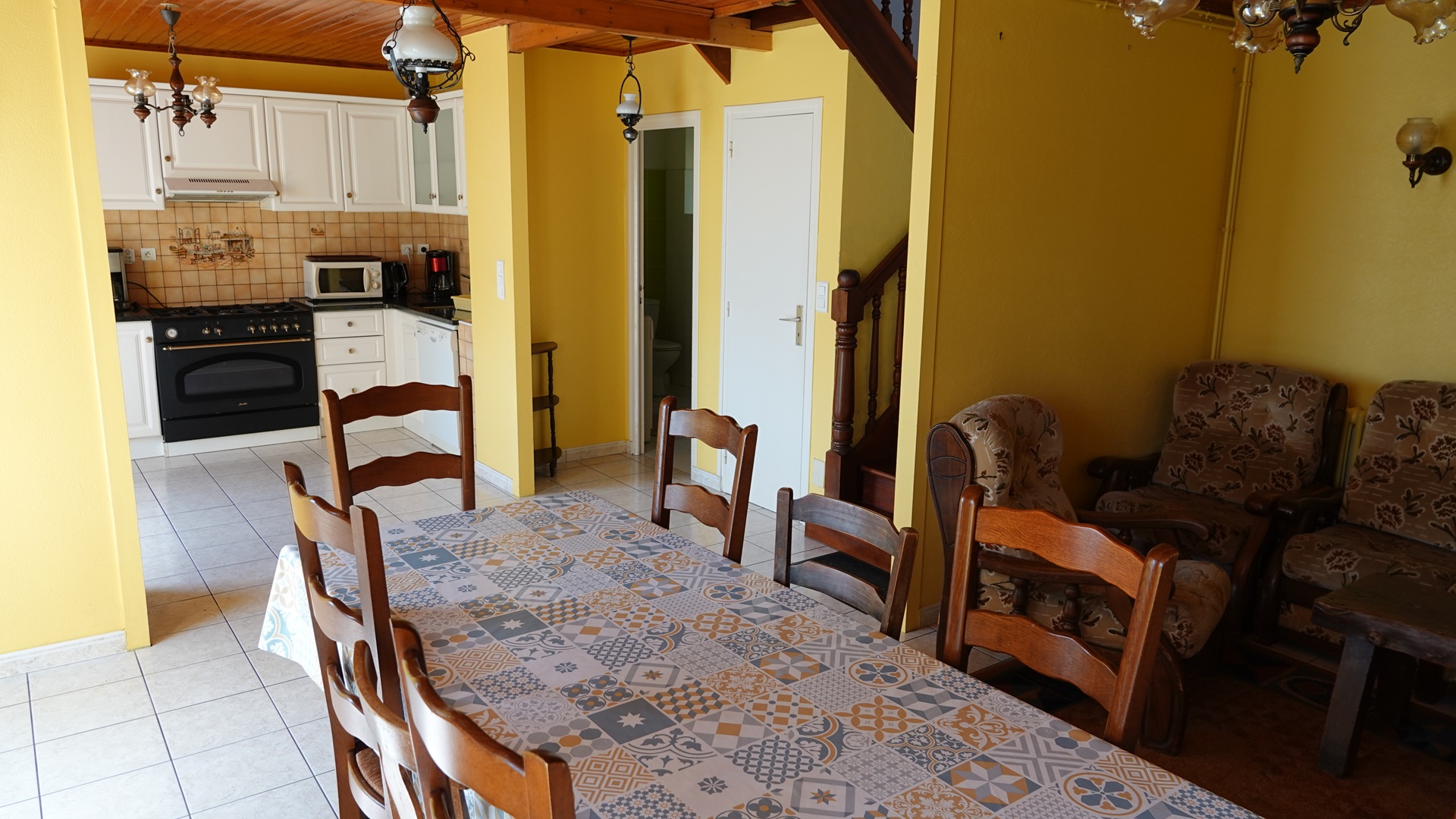 A l’étage : 1 chambre pour 3 personnes : 1 lit double et 1lit simple, 2 chambres pour 2 personnes avec 2 lits simples, salle de bain et WC
