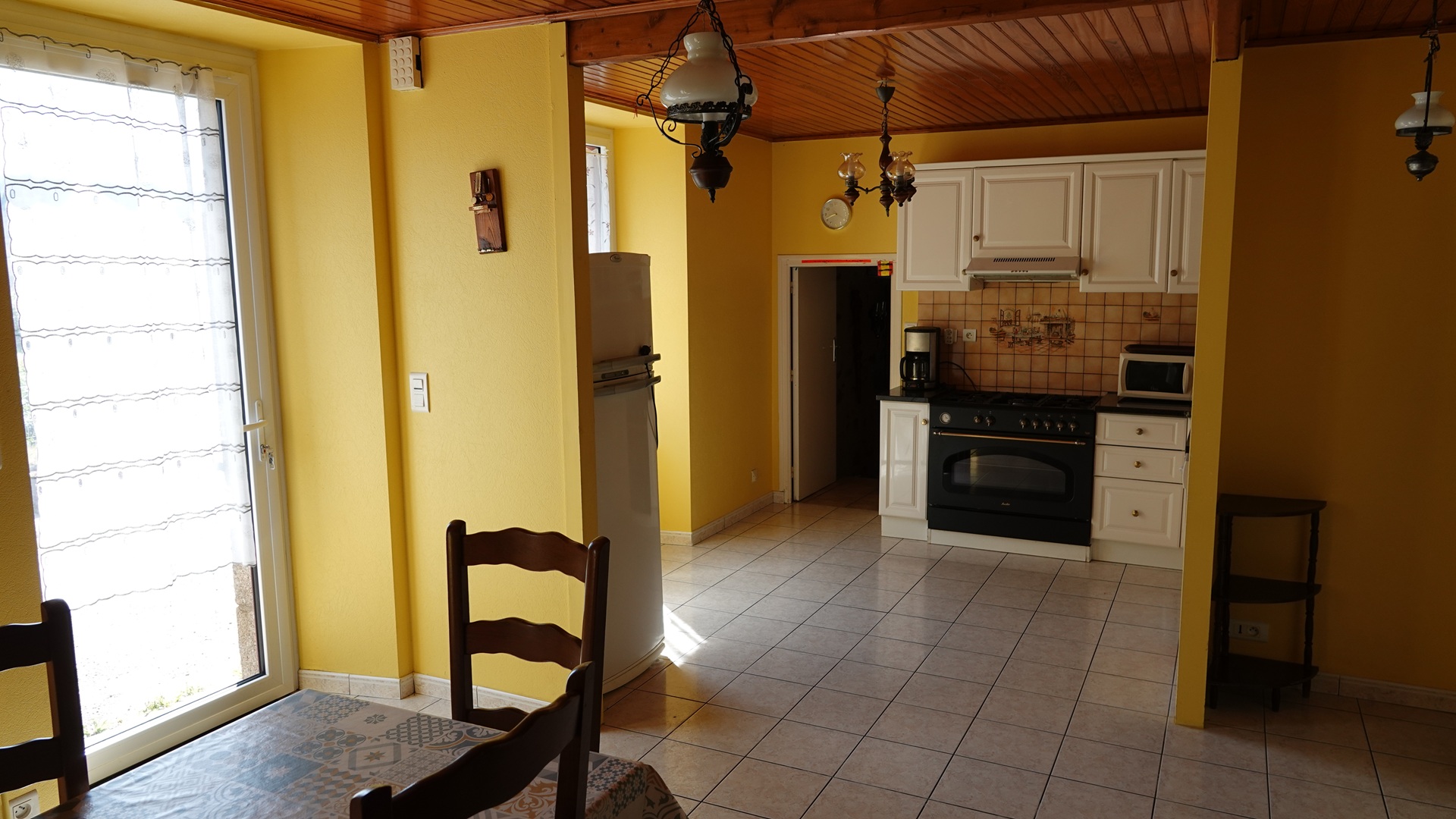 Cuisine : piano de cuisine, plaque de gaz et four, lave-vaisselle, frigo, cafetière, évier et vaisselle