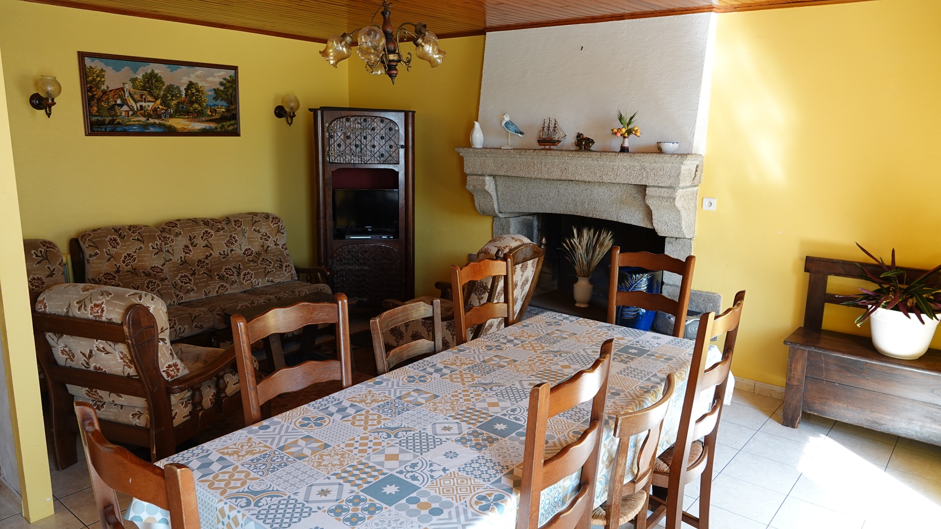 Espace repas pour 8 personnes, coin canapé avec table basse et TV